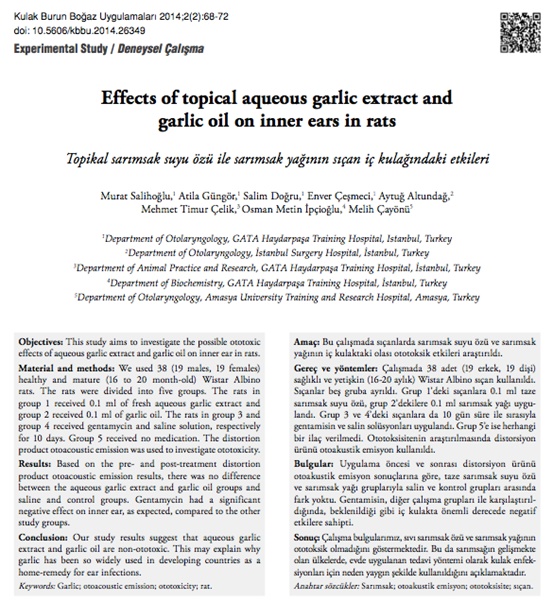 Günümüzde tedavi amaçlı soğan ve sarımsak suyunun kulağa damlatılmasını kesinlikle önermiyoruz. Bununla birlikte eskilerde uygulanan soğan ve sarımsak suyunun kulak hastalıklarındaki güvenilirliğini deney hayvanları üzerinde araştırdım.